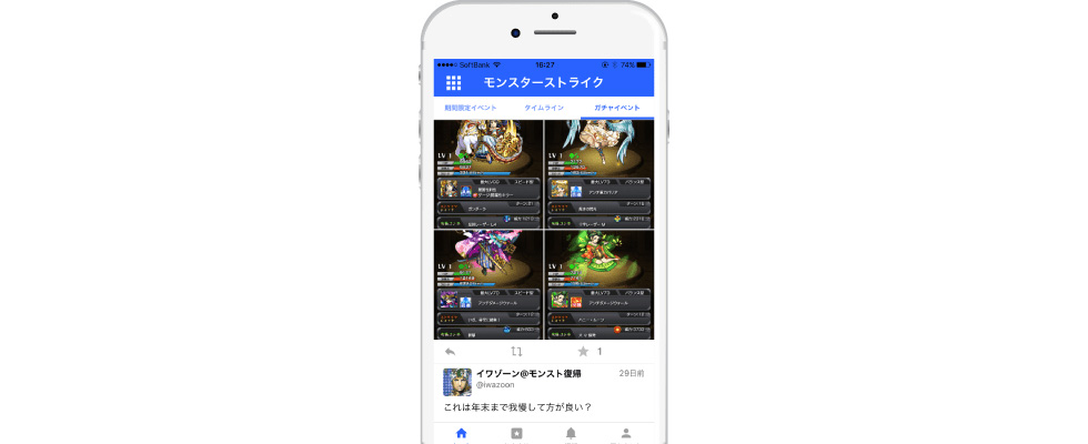 GameBandは「ガチャ結果」「イベント情報」を#タグを使って共有・収集ができる、ゲームを楽しむ人のための投稿型SNSです。Twitterでゲームアカウントをお持ちの方は必見のアプリです。